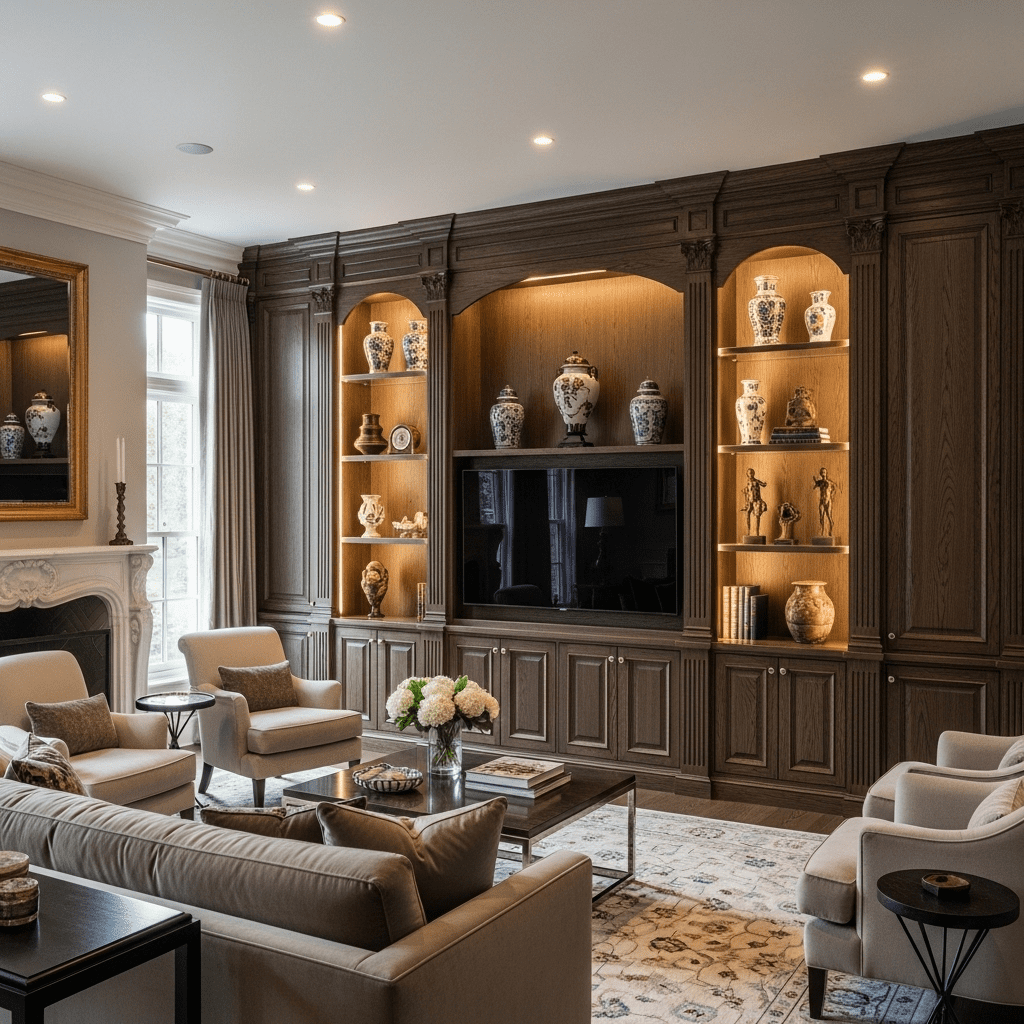 Custom floor-to-ceiling millwork integrates TV, storage, display shelving, and concealed cabinets in cohesive luxury installations. Premium materials, LED lighting, and architectural details create bespoke elegance.