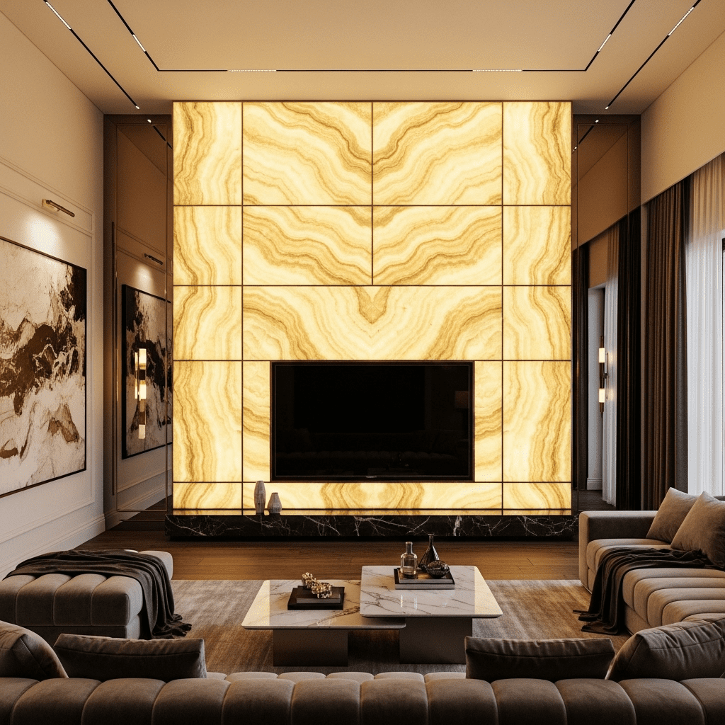Translucent onyx panels backlit with LED create glowing, ethereal feature walls behind mounted TVs. The stone’s natural patterns become illuminated artwork, adding dramatic ambiance to luxury spaces.