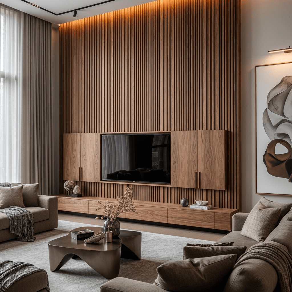 Vertical or horizontal premium wood slats create architectural texture while concealing storage and wiring. Species like teak, walnut, or oak add organic luxury with contemporary edge.