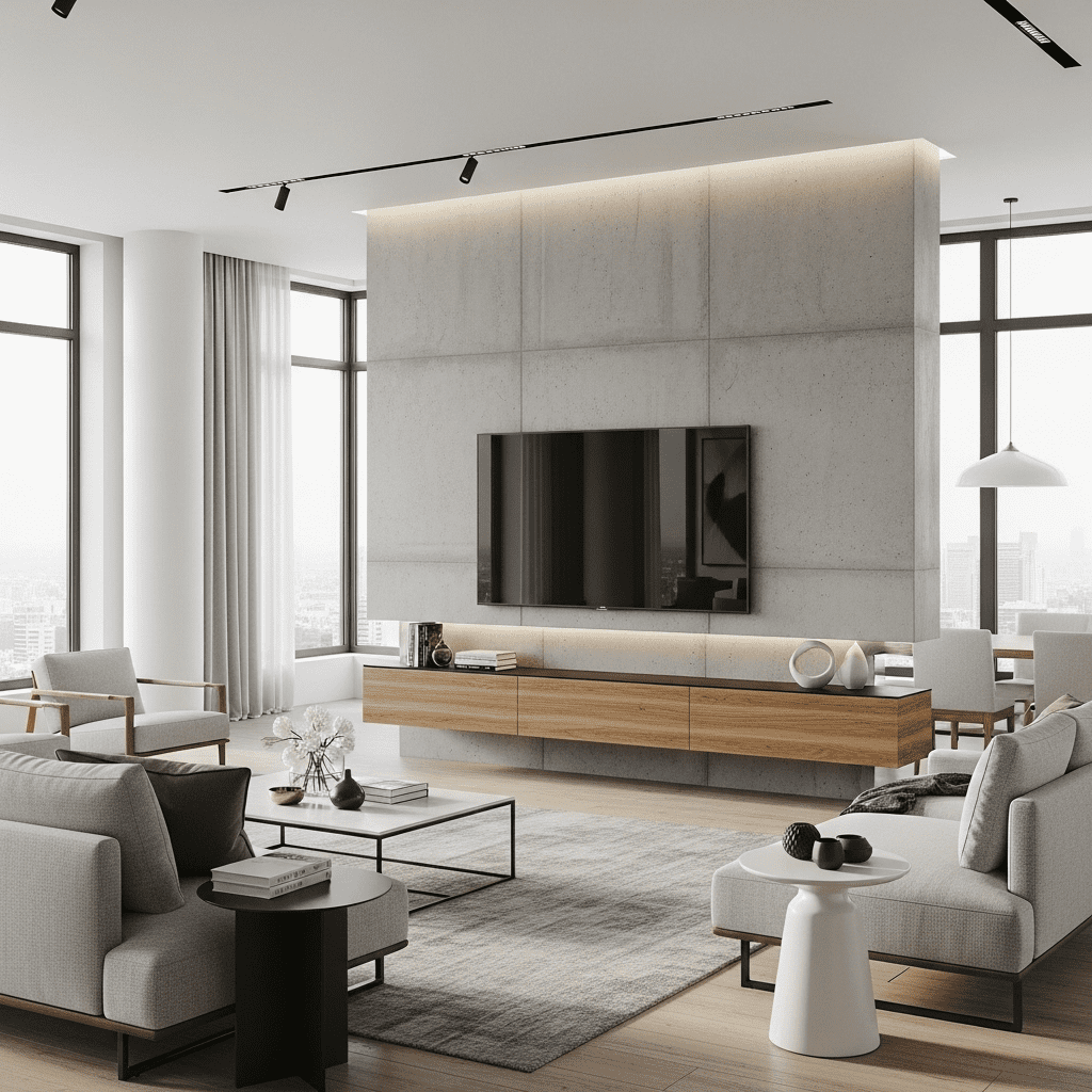 Polished concrete panels paired with warm wood create striking material juxtaposition. The raw-meets-refined aesthetic delivers modern luxury with architectural substance.
