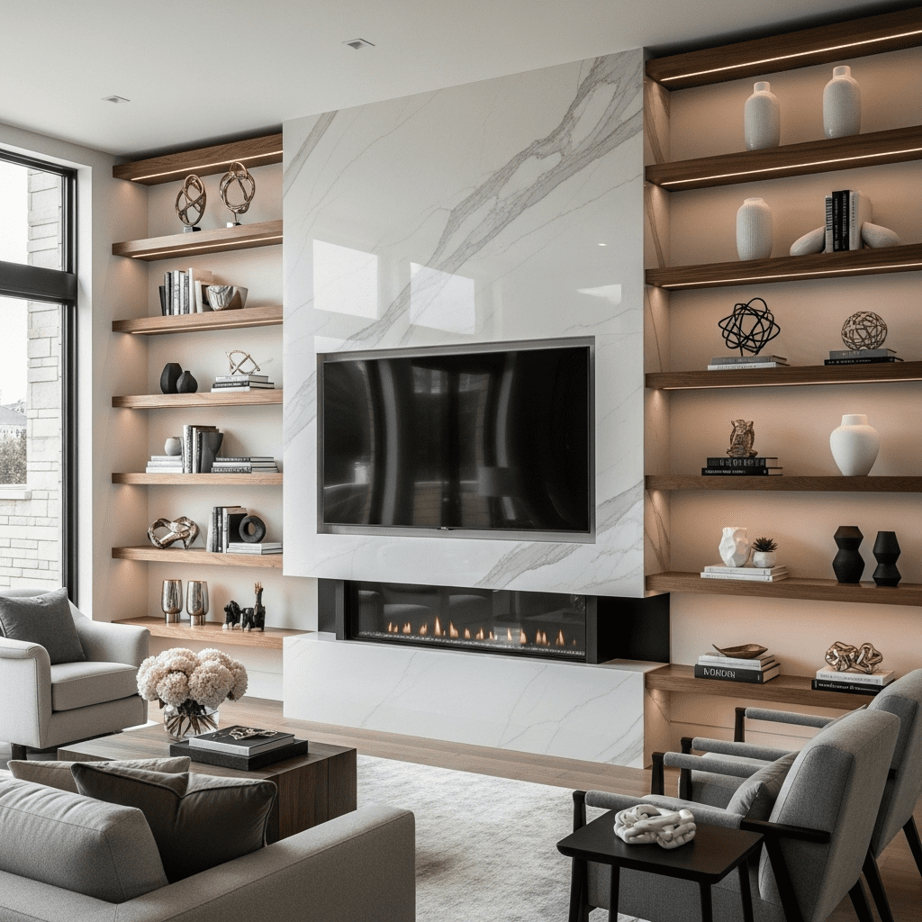 Combine linear gas fireplaces with TV installations for ultimate luxury focal points. Stone, marble, or wood surrounds create cohesive entertainment and ambiance centers.