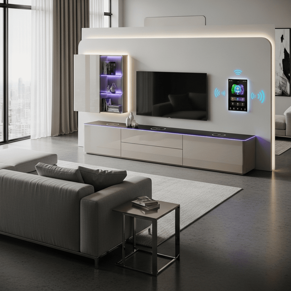 High-end modular units in premium finishes allow customization while maintaining luxury aesthetics. Integrated RGB LED lighting, wireless charging, and smart home compatibility define modern luxury.