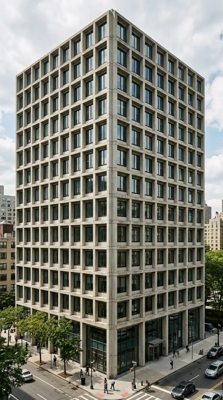 The grid facade is a regular grid of columns and beams. The grid is structural and expressive. The grid facade is rational, repetitive, and modern.