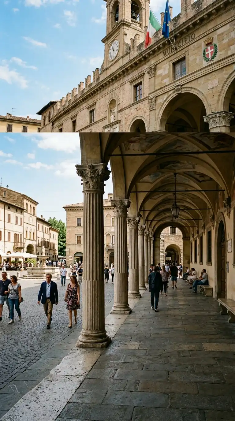 The loggia is a recessed colonnade. The columns are set back from the facade. The loggia creates a shaded walkway. The loggia is shaded, recessed, and rhythmic.