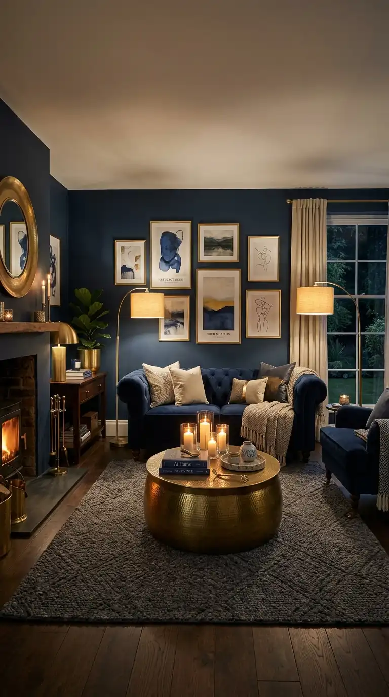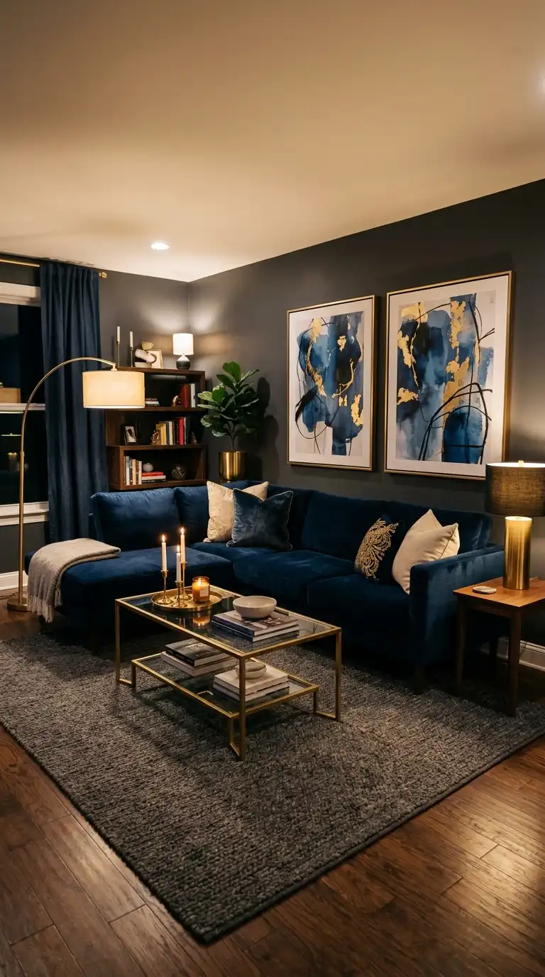 A midnight blue velvet sectional anchors a moody living room. Layer your lighting—overhead fixtures, floor lamps, table lamps, and candles—to create pools of warm light throughout the space.