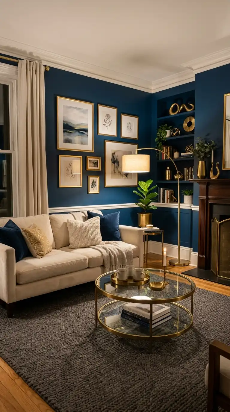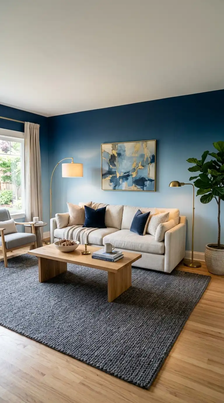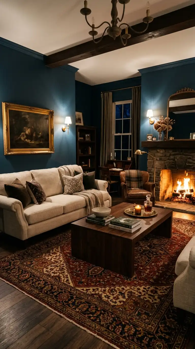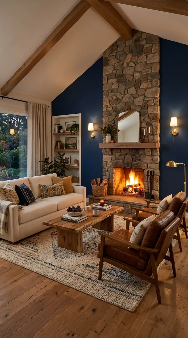 A dark blue accent wall behind a fireplace creates a dramatic focal point. Paint the wall in navy or midnight blue, and let the fireplace become the heart of the room. Arrange comfortable seating facing the hearth.
