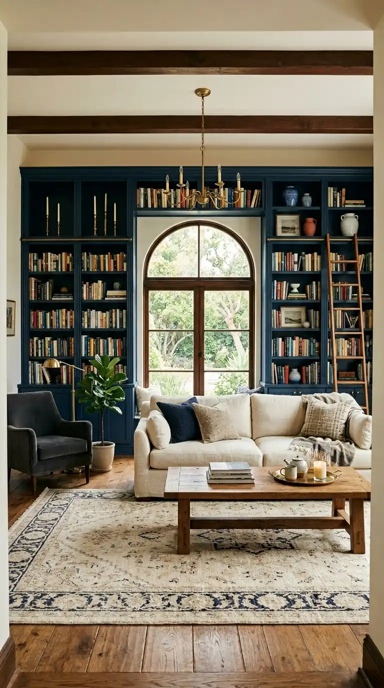 6. Dark Blue Built-Ins with Books and Warm Accents