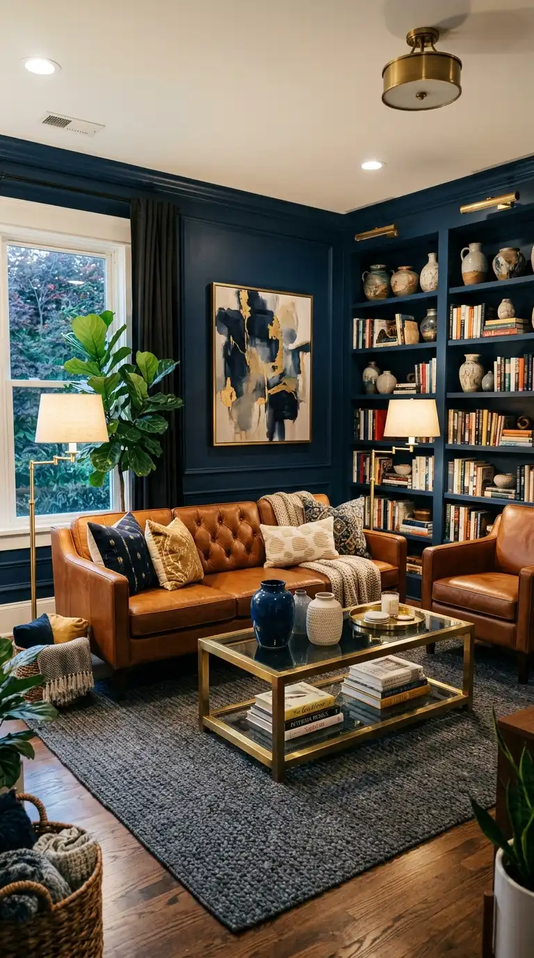 Navy blue walls paired with warm leather furniture create a rich, masculine palette that feels both sophisticated and inviting. Cognac or chestnut leather adds warmth and texture against the cool blue.