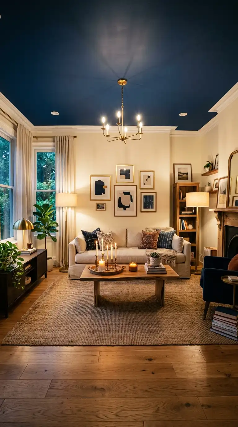 Painting the ceiling in a deep blue creates a cocooning, intimate atmosphere. Keep walls lighter to balance the darkness above, and use warm lighting to prevent the space from feeling too heavy.