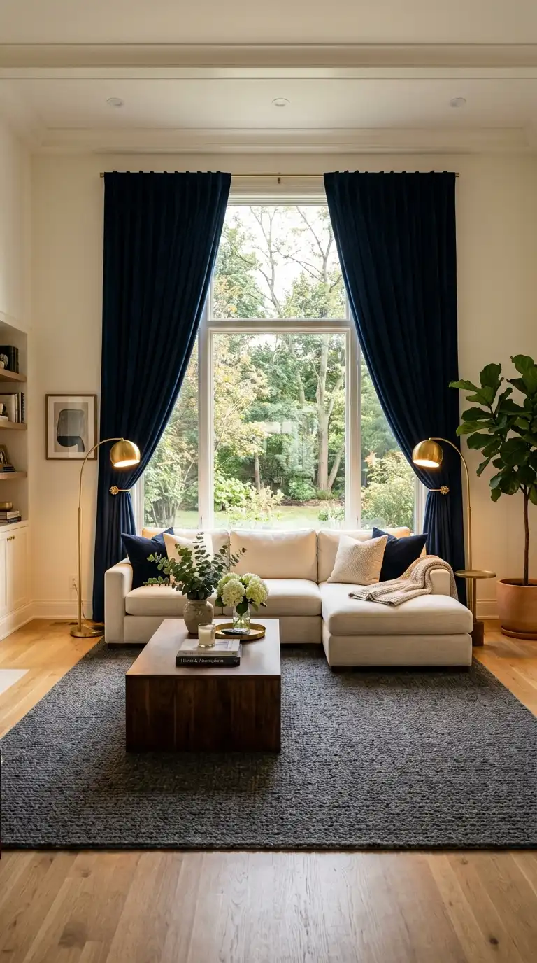 Floor-to-ceiling blue blackout curtains add drama and create a cozy, den-like atmosphere. Choose a deep navy or midnight blue in a heavy fabric like velvet for maximum impact.