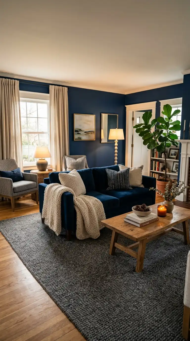 Layered textures enhance the cozy, moody feel of a dark blue living room. Combine velvet upholstery, chunky knit throws, wool rugs, and linen curtains to add warmth and visual interest.