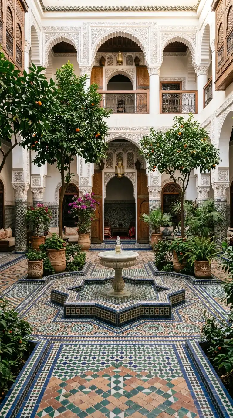 The Moroccan courtyard is the heart of the riad. It is paved with tile (zellij). It has a central fountain. It is planted with orange trees or jasmine. The courtyard is shaded by the surrounding building. The Moroccan courtyard is tiled, fountained, and shaded.