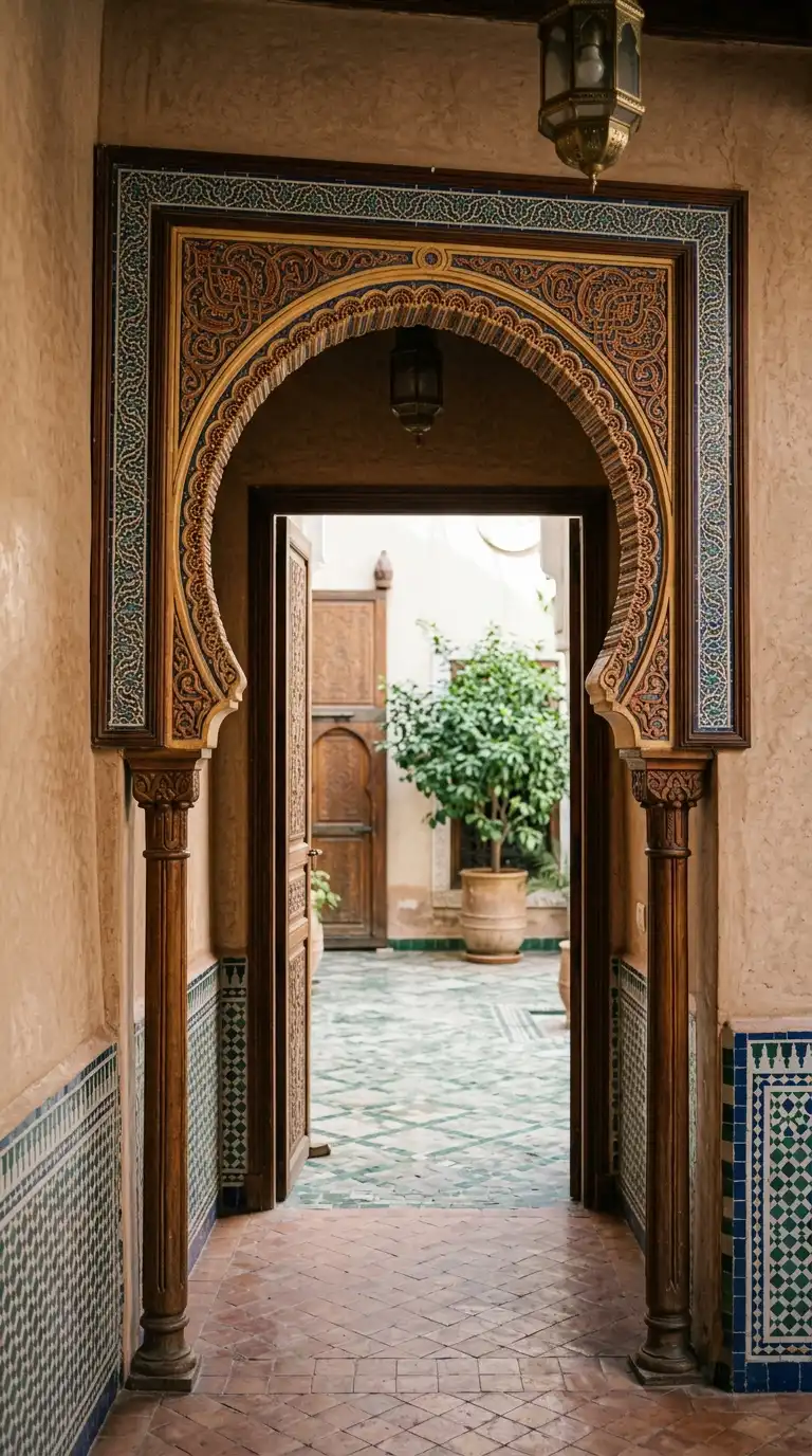 The Moroccan arch is a horseshoe or pointed arch. The horseshoe arch curves inward at the base. The pointed arch rises to a point. Both are used in doorways, windows, and arcades. The Moroccan arch is horseshoe-shaped, pointed, or arched.