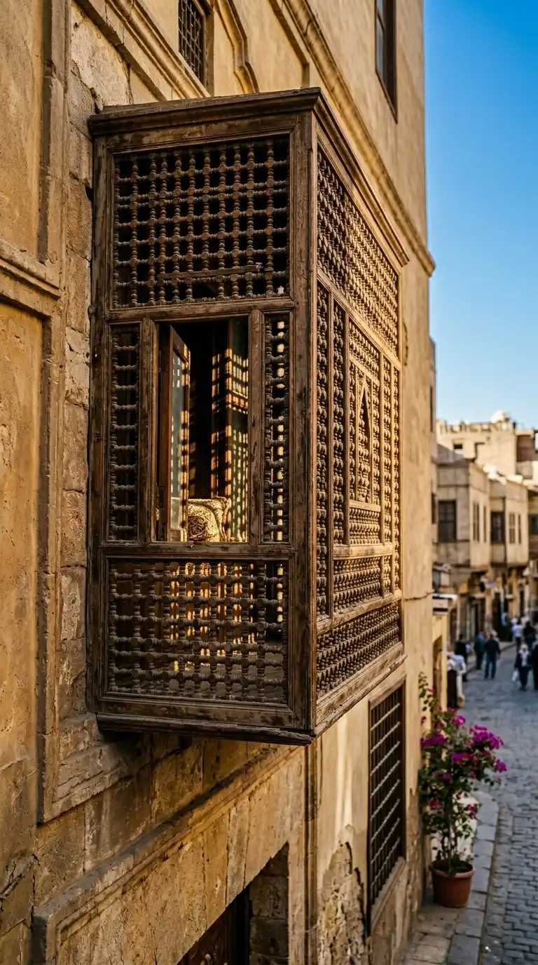 The mashrabiya is a wooden lattice screen. It is used on windows and balconies. The mashrabiya provides privacy, shade, and ventilation. It allows the occupant to see out without being seen. The mashrabiya is wooden, latticed, and private.