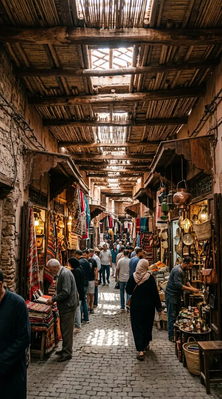 The souk is a covered market street. The street is lined with shops on both sides. The roof is wooden beams and reeds, with occasional openings for light. The souk is shaded, narrow, and commercial.