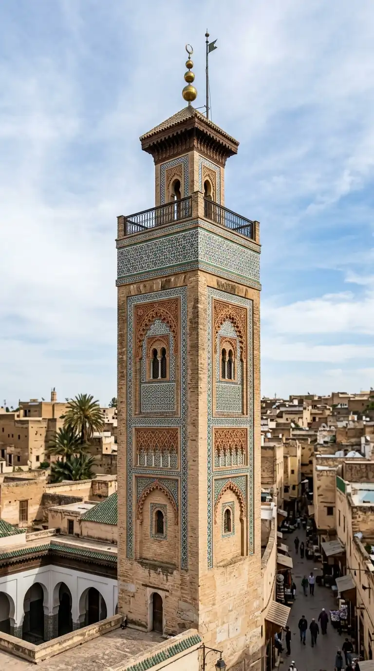 The Moroccan minaret is square in plan. It is tall and slender. It has decorative bands of tilework or carving. The top has a smaller lantern tower and metal spheres. The minaret is square, vertical, and decorative.