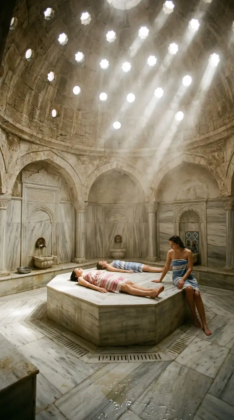 The hammam is a traditional Moroccan bathhouse. The plan is a sequence of three rooms: cold, warm, and hot. The hot room has a domed ceiling with small glass openings. Light streams through the openings, creating a starry effect. The hammam is steamy, social, and relaxing.