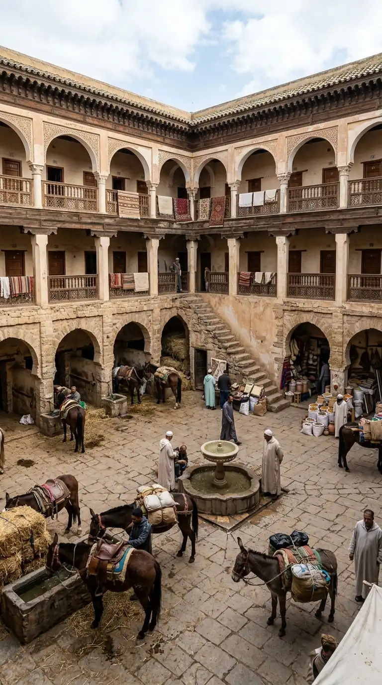 The fondouk is a traditional inn for merchants and their animals. It has a large central courtyard. The ground floor has stables and storage. The upper floor has rooms for travellers. The fondouk is courtyard-centred, arcaded, and commercial.