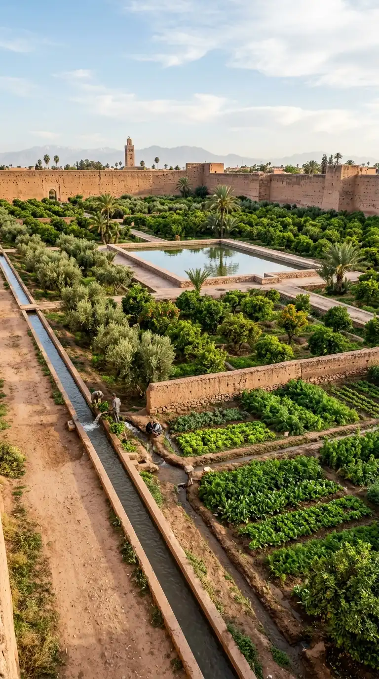 The agdal is a large walled garden or agricultural estate. It has orchards, vegetable gardens, and water basins. The agdal is irrigated by a traditional water system (khettara). The agdal is walled, watered, and agricultural.