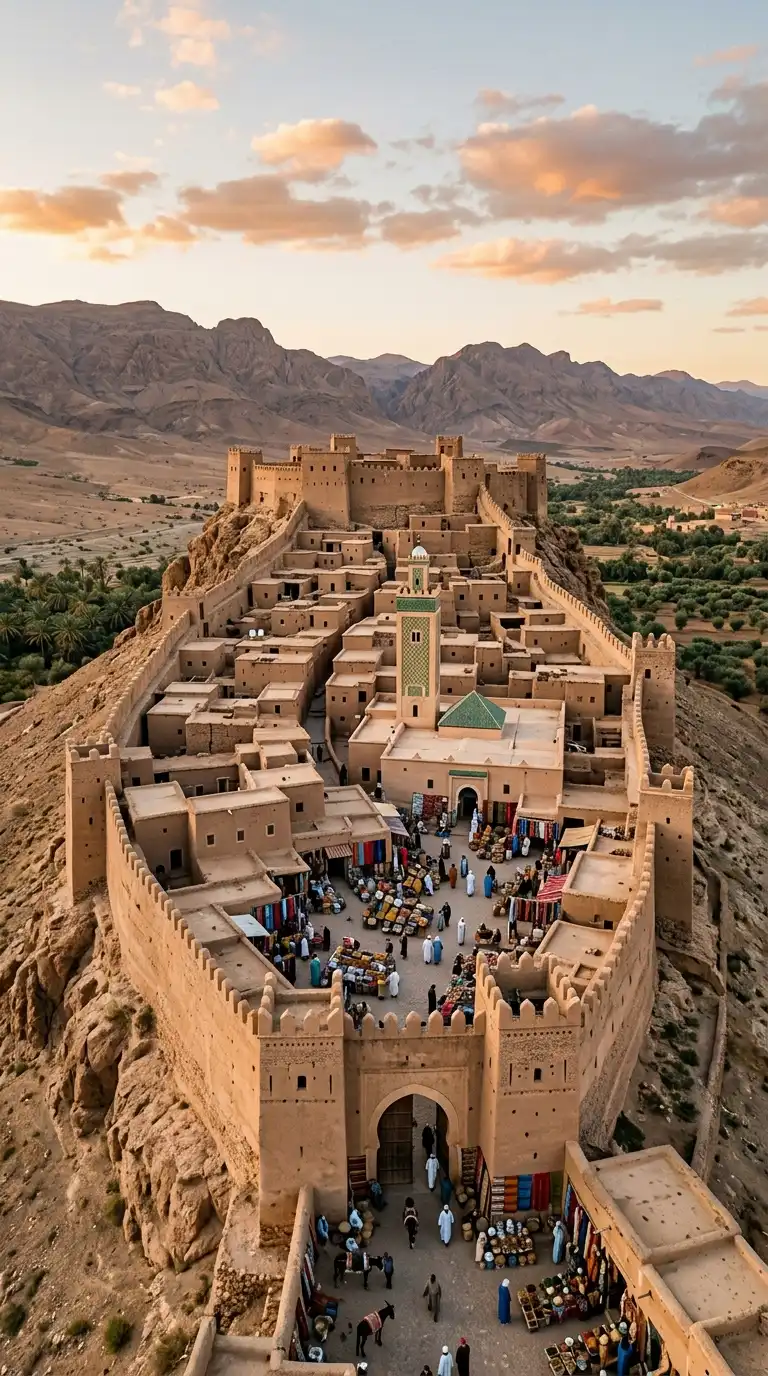 The kasbah is a fortified village or citadel. It has high defensive walls, a gate, a mosque, a market, and houses. The kasbah is often on a hilltop. The kasbah is defensive, walled, and village-like.