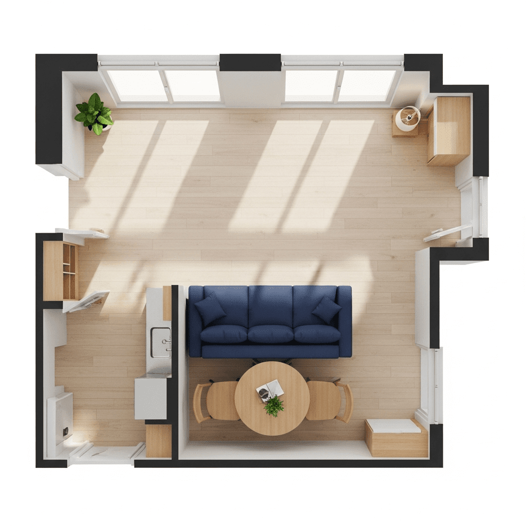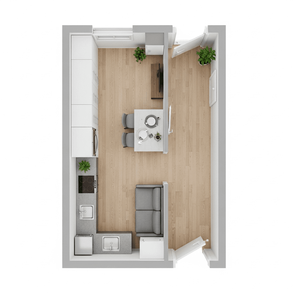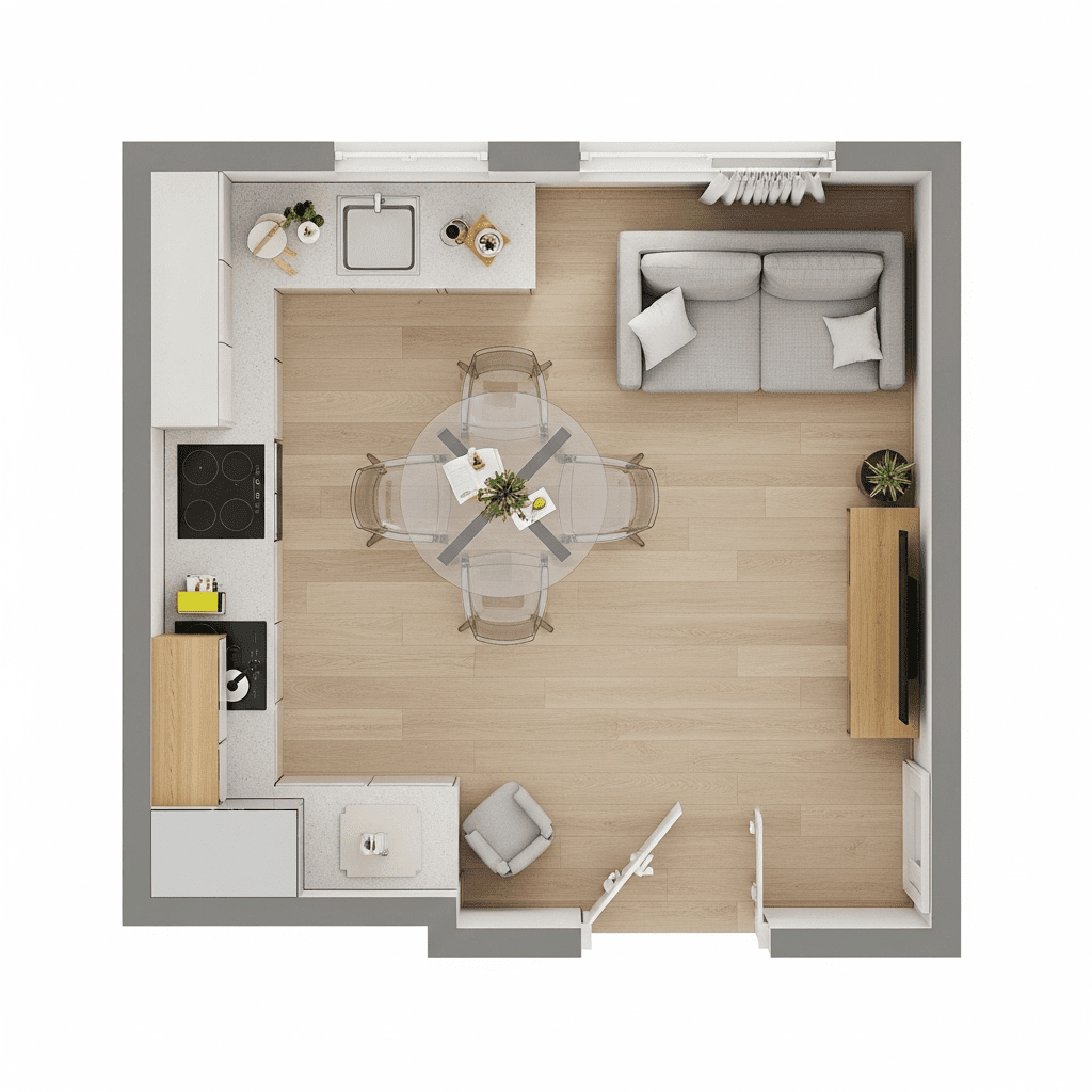 Successfully designing a small open-concept apartment is about mastering the “visual flow.” By looking at your home from a top-view perspective, you can ensure that walkways are clear and that each zone—kitchen, dining, and living—has enough breathing room to function independently. Stick to multi-purpose furniture and a cohesive material palette to keep the space looking sophisticated and serene.