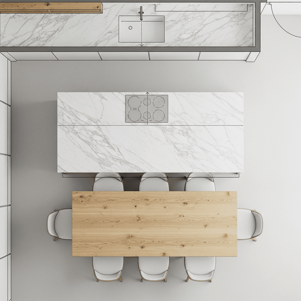 Extend your kitchen island with a lower-level wooden surface that serves as the primary dining table. This “stepped” design saves the floor space usually required for a standalone dining set.