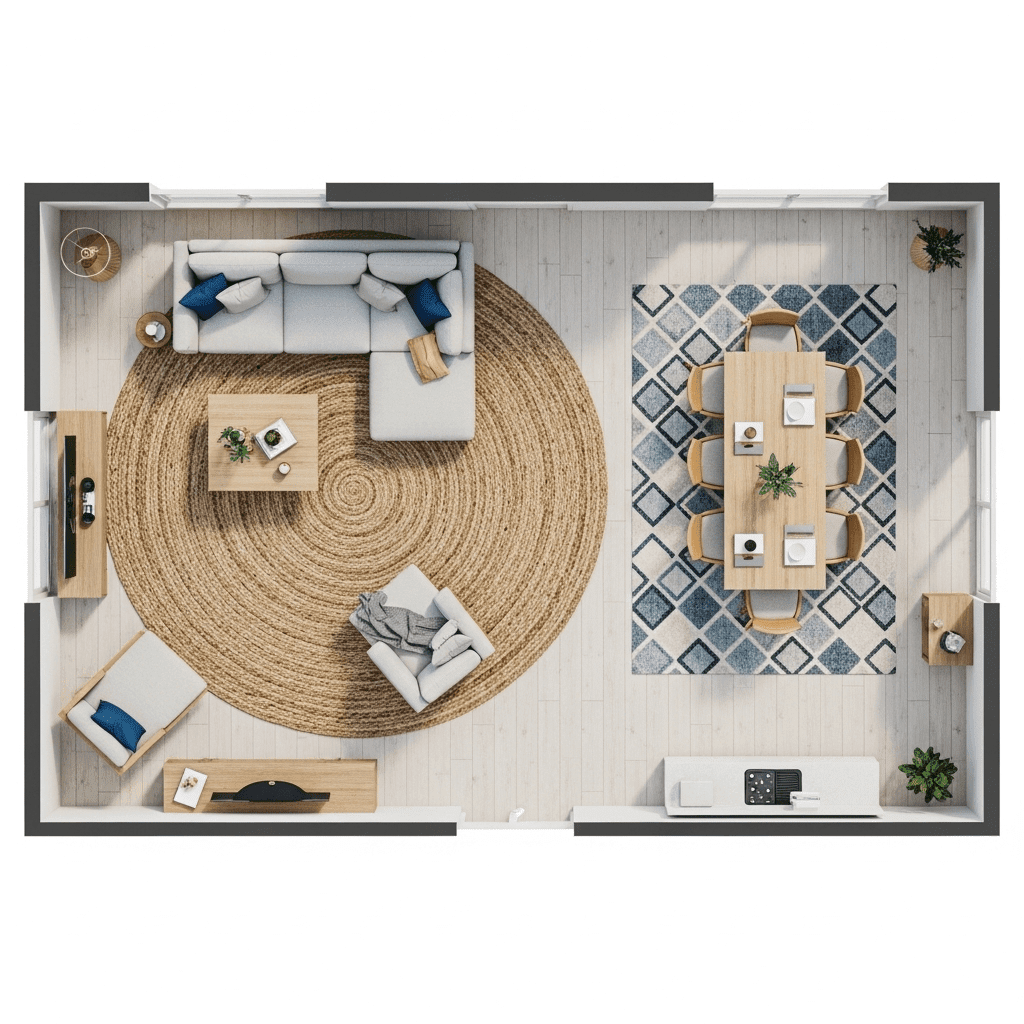 Place a large rug under the living room furniture and a different, low-pile rug under the dining table. This creates “soft walls” that define each zone without blocking the view.