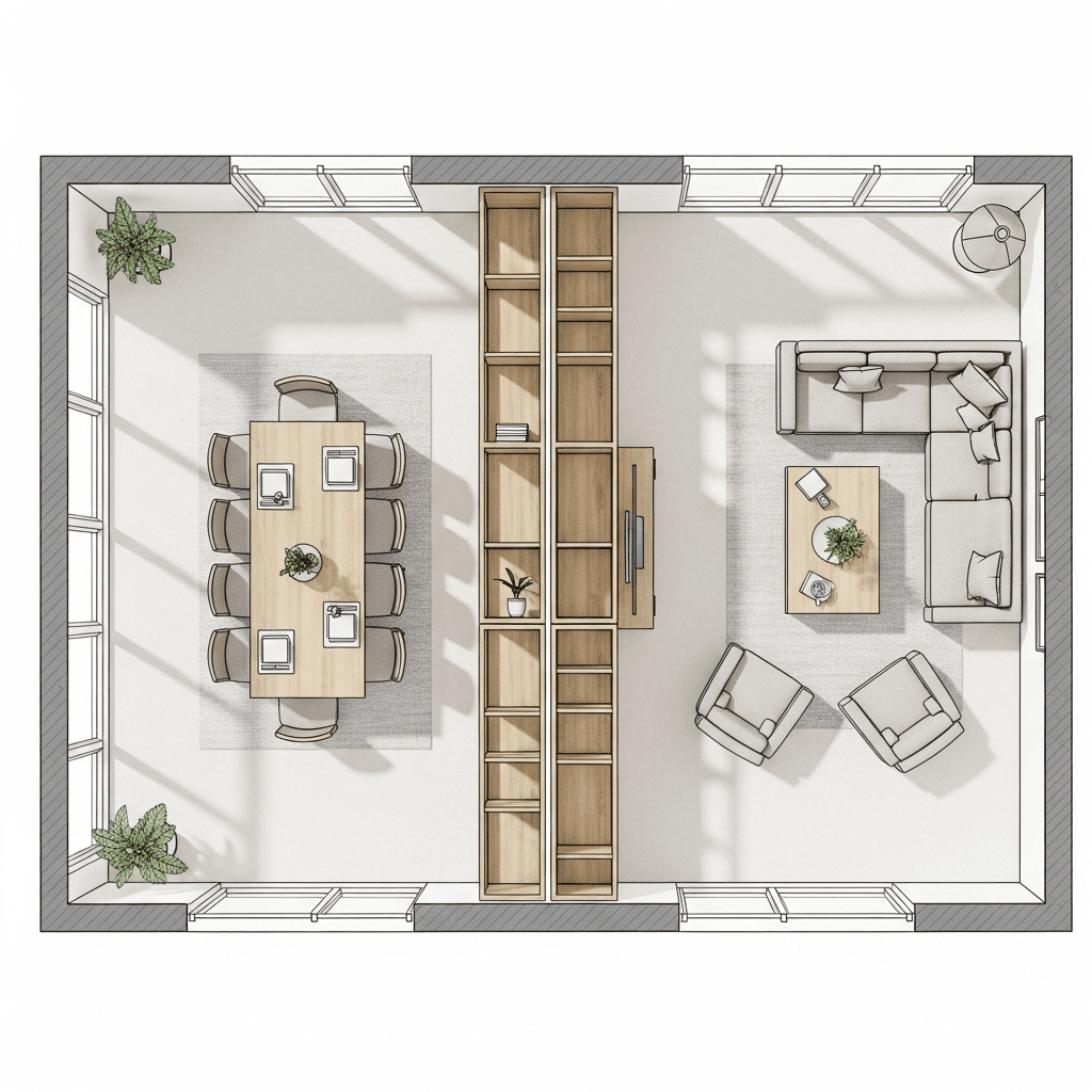 Use an open, double-sided bookshelf as a “transparent wall” between the dining table and the sofa. It provides storage and definition while allowing light and conversation to pass through.
