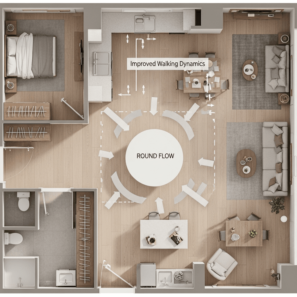 Choose a round pedestal dining table. The absence of four corner legs makes the transition between the kitchen and the living room feel much smoother and easier to navigate.