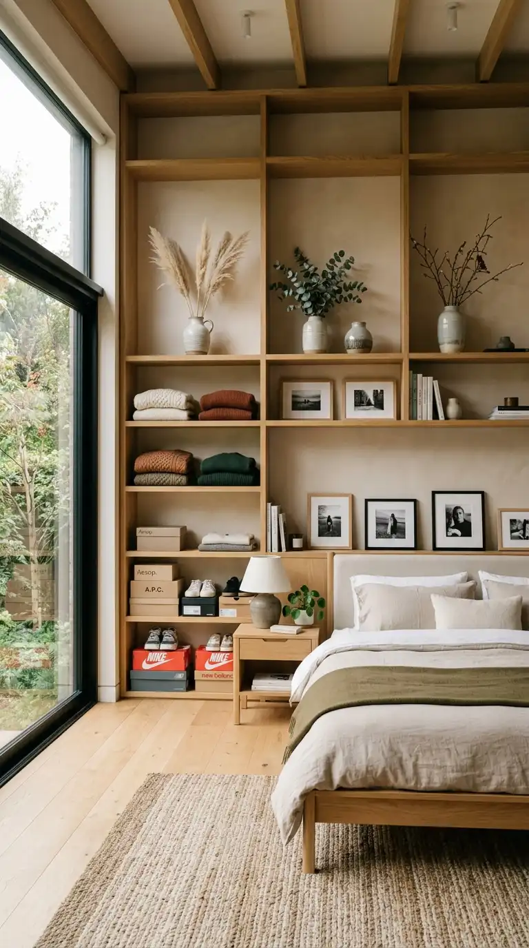 Floor-to-ceiling open shelving creates a dramatic, library-like effect in a bedroom or dressing room. The continuous vertical surface draws the eye upward, making the space feel taller and more expansive. Use adjustable shelves to accommodate items of varying heights—folded knitwear, shoe boxes, bags, and display objects. Keep the arrangement curated, leaving space between items to allow the eye to rest. This design works beautifully in modern, Scandinavian, and minimalist interiors where simplicity and order are paramount.