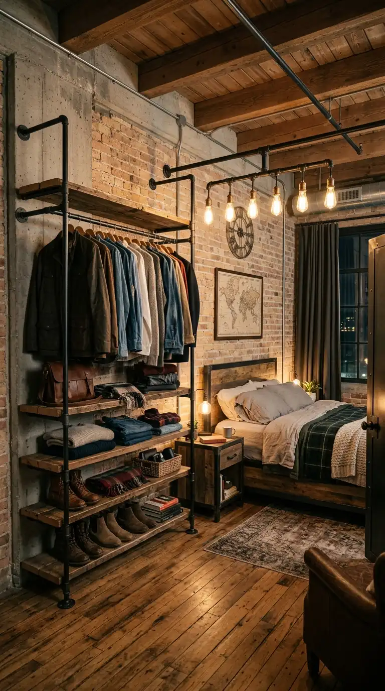 Industrial-style open wardrobes combine raw materials like black metal pipes and reclaimed wood for a rugged, urban aesthetic. Use pipes to create a framework for hanging rods, and incorporate wooden shelves for folded items. The exposed construction becomes a design feature, celebrating the structural elements of the wardrobe. This style is perfect for loft apartments, industrial-inspired spaces, and bedrooms that embrace an edgy, unpolished look. Add vintage-inspired hooks for accessories and Edison bulb lighting to complete the aesthetic.