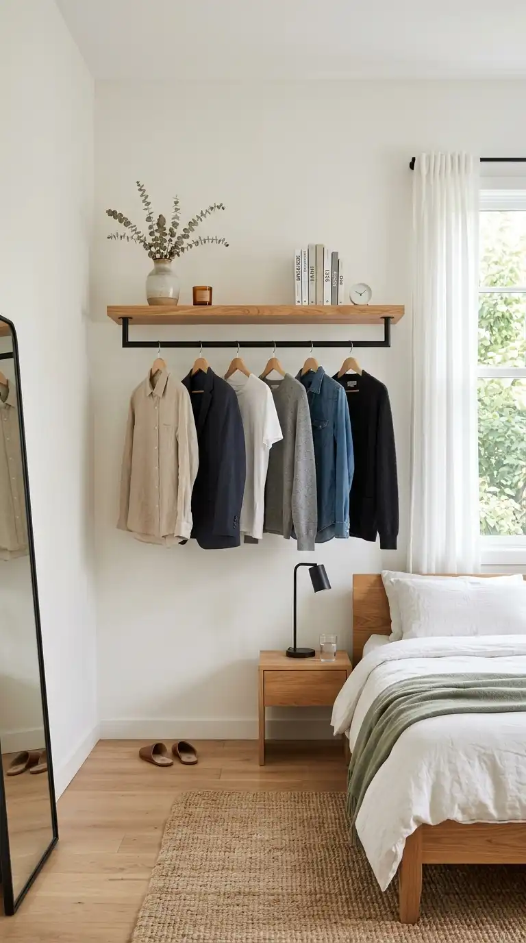 A wall-mounted open wardrobe creates a floating effect that adds lightness to a room. Mount a simple rail for hanging clothes, and add a narrow shelf above for display or storage. Keep the palette minimal—black or brass hardware against white walls—to emphasize clean lines. This approach is ideal for compact bedrooms or spaces where a traditional wardrobe would feel bulky. The visibility of the contents encourages intentional selection, ensuring only your most loved pieces are on display.