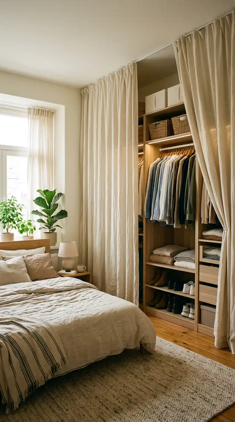 For those who want the accessibility of an open wardrobe but prefer a softer aesthetic, replace doors with a curtain. A floor-to-ceiling curtain in linen, cotton, or velvet provides the flexibility to conceal the wardrobe when desired while maintaining a light, textured look. This approach softens the overall appearance of the wardrobe and adds a layer of warmth to the room. Choose a curtain in a neutral tone to blend with the walls, or opt for a bold color or pattern for a statement.