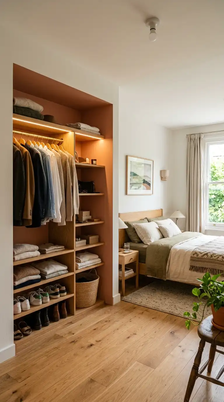 If your bedroom has an alcove or recessed wall, transform it into a built-in open wardrobe. The recessed space provides natural definition, and custom shelving and hanging rods can be fitted precisely to the alcove’s dimensions. This design makes use of otherwise awkward space while creating a seamless, integrated look. Paint the interior a contrasting color to create depth, or line the back wall with wallpaper for a surprise element. Add integrated lighting to highlight the contents and make the alcove feel like a designed feature.