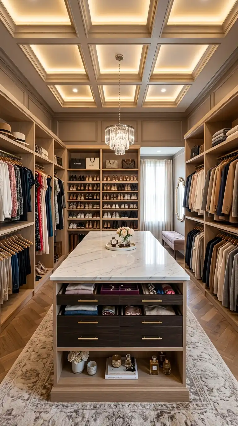 For larger spaces, combine an open wardrobe with a central island to create a boutique-inspired dressing area. The island provides additional storage for accessories, a surface for folding, and a focal point for the room. Surround the island with open shelving and hanging rods arranged along the walls. Use uniform hangers and neatly folded items to maintain a polished appearance. This design works beautifully in walk-in closets and master suites where space allows for a dedicated dressing zone.