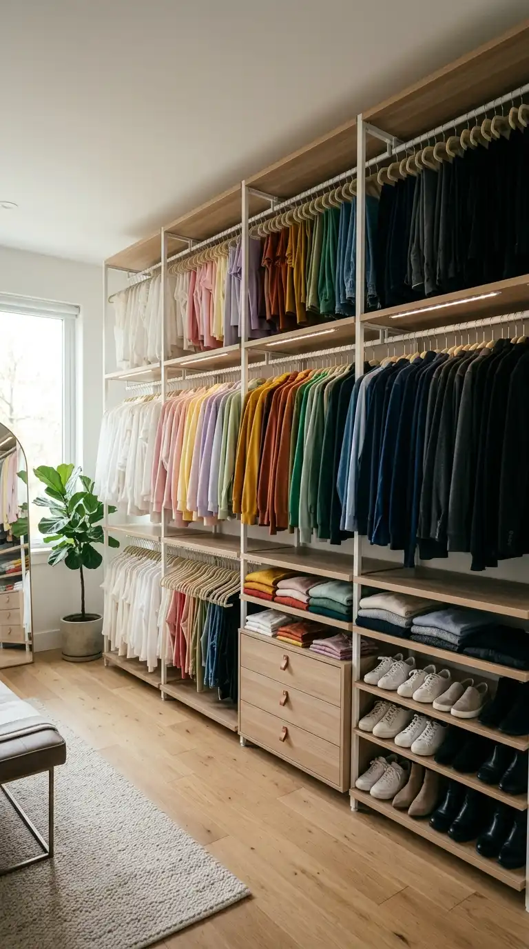 An open wardrobe becomes a visual statement when organized by color. Arrange clothing in a gradient from light to dark, creating a rainbow effect that transforms garments into art. This approach requires a disciplined approach to editing and organization but results in a stunning, Instagram-worthy display. Use uniform hangers to maintain consistency, and limit the palette to colors that work together harmoniously. This design is perfect for those who view their wardrobe as an extension of their personal style.