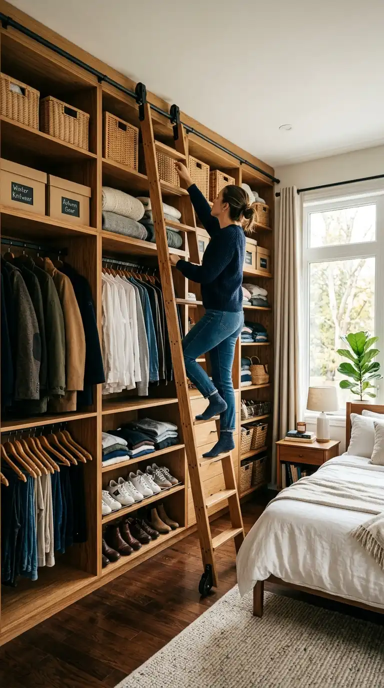 For floor-to-ceiling open wardrobes, a sliding ladder adds functionality and a touch of elegance. The ladder provides access to high shelves while serving as a decorative element when not in use. Choose a ladder in a material that complements your wardrobe—wood for warmth, metal for industrial edge. This design works particularly well in rooms with high ceilings, where upper shelves might otherwise be inaccessible. The ladder adds a sense of purpose and craftsmanship to the space.