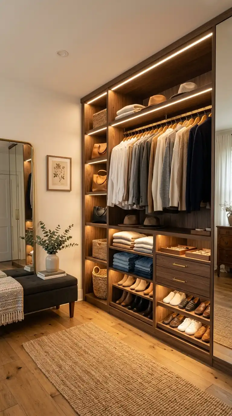 Integrated lighting transforms an open wardrobe from functional storage to a dramatic display. Install LED strip lights along shelves or above hanging rods to highlight the contents and create a warm, inviting glow. Lighting adds depth and dimension, making the wardrobe feel like a curated exhibition. Use warm white lighting (2700K–3000K) for a soft, flattering effect. This design is especially effective in dressing rooms and master suites where the wardrobe is a central feature.