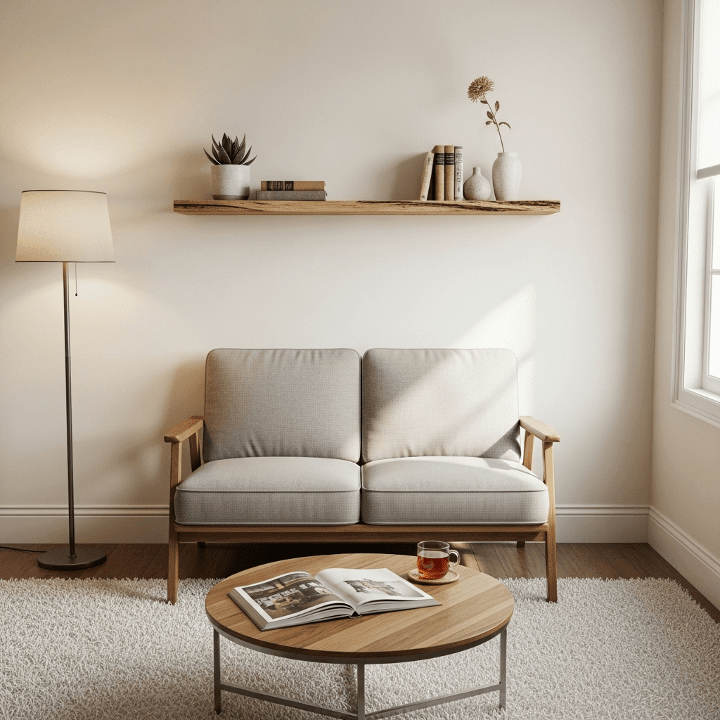 Organic modern living room small spaces designs utilize vertical storage made from natural timber. A single, thick floating shelf with a live edge serves as a media console or display, keeping the floor clear while introducing an organic, rugged element.