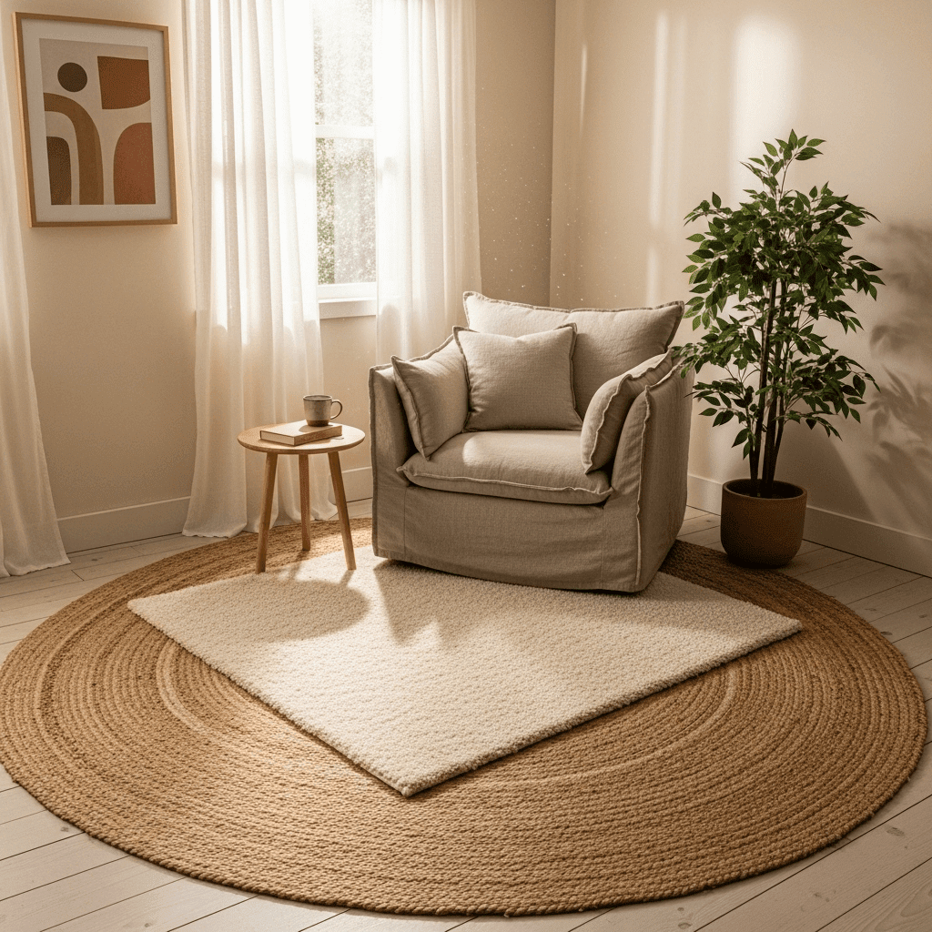 Organic modern living room small spaces designs use natural fiber rugs to anchor the seating zone. Layering a smaller, soft wool rug over a large jute base adds comfort and texture, making the floor plan feel unified and expansive.
