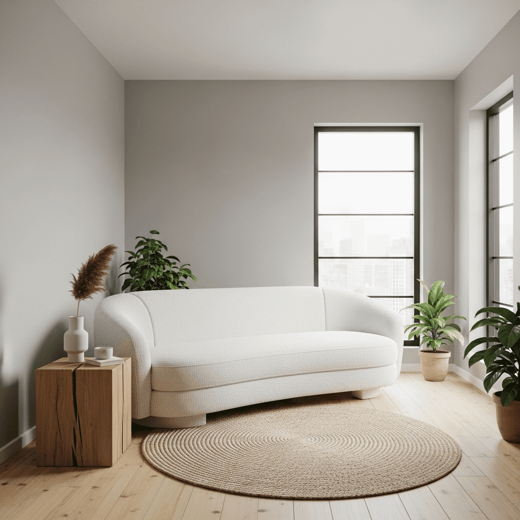 Organic modern living room small spaces designs often feature a small, curved sofa upholstered in white bouclé. The rounded edges soften the boxy corners of a small room, while the nubby texture adds visual depth without requiring heavy patterns.