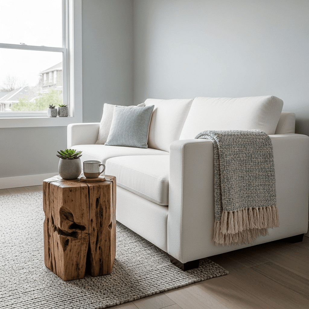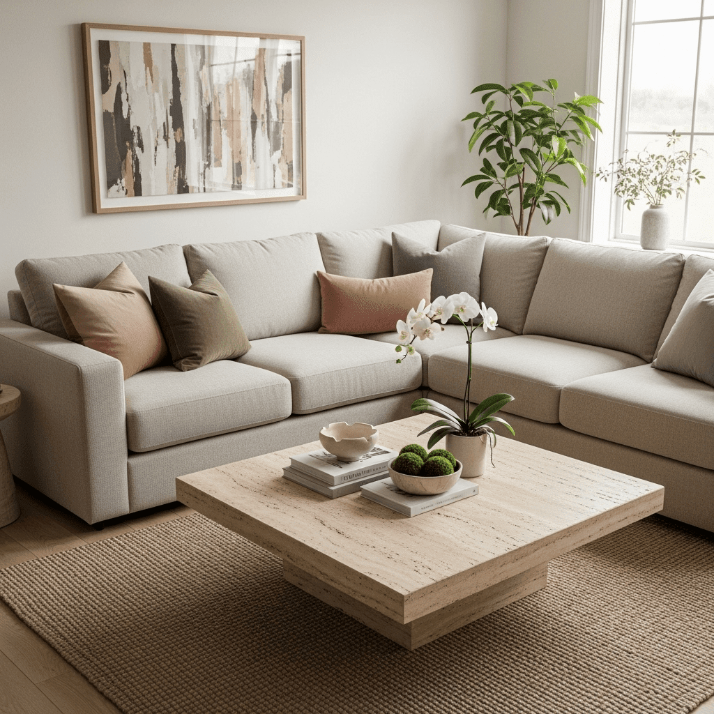 Organic modern living room small spaces designs substitute bulky coffee tables for low travertine or limestone plinths. The stone’s natural veining and matte finish provide a high-end, grounded focal point that feels like a piece of earth in the center of the room.