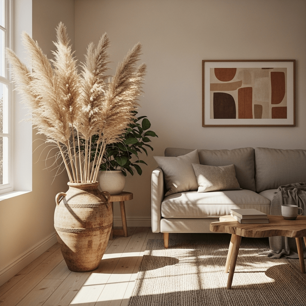 Organic modern living room small spaces designs often use oversized dried elements like pampas grass or palm leaves instead of colorful flowers. These neutral-toned botanicals add height and a wild, organic feel without cluttering the color palette.