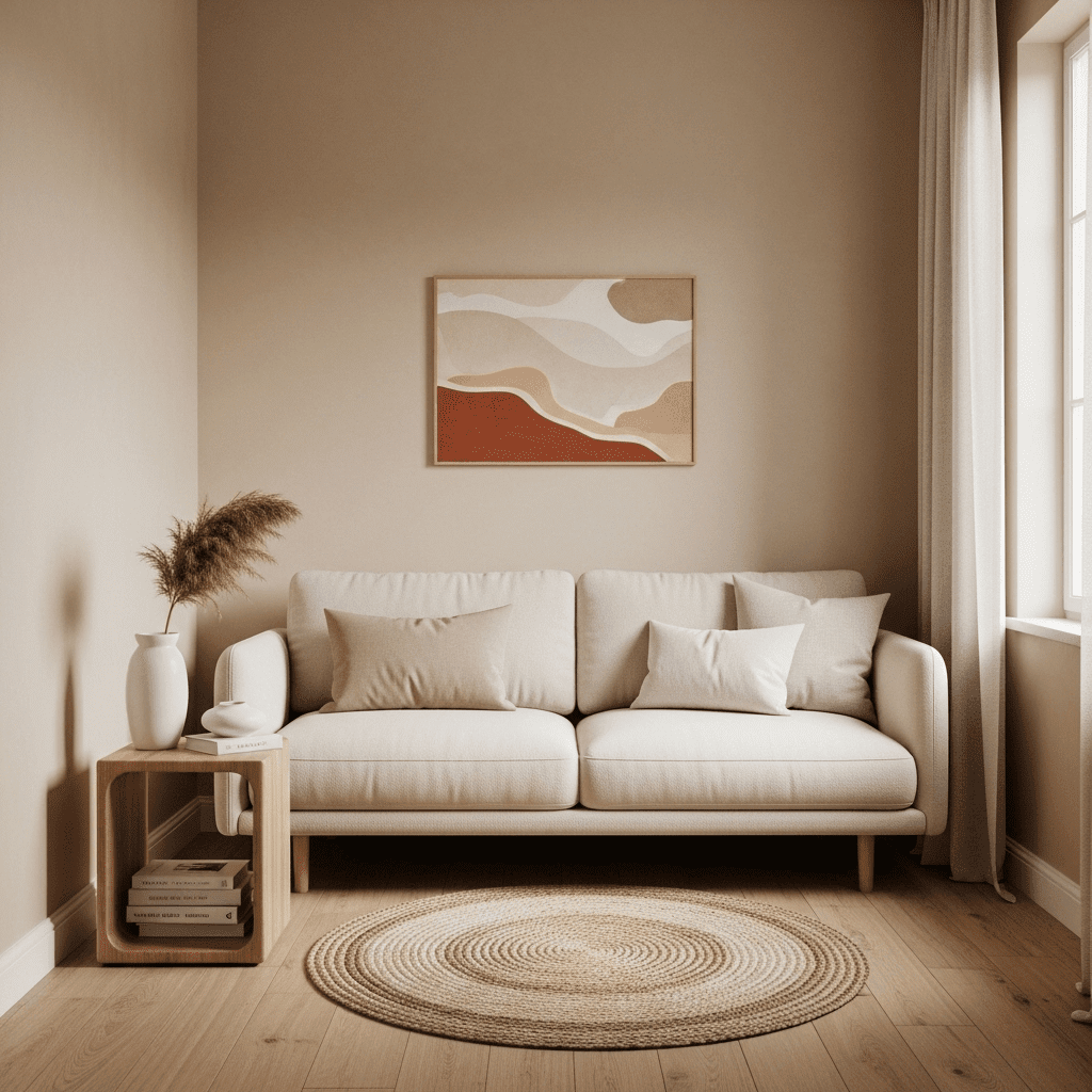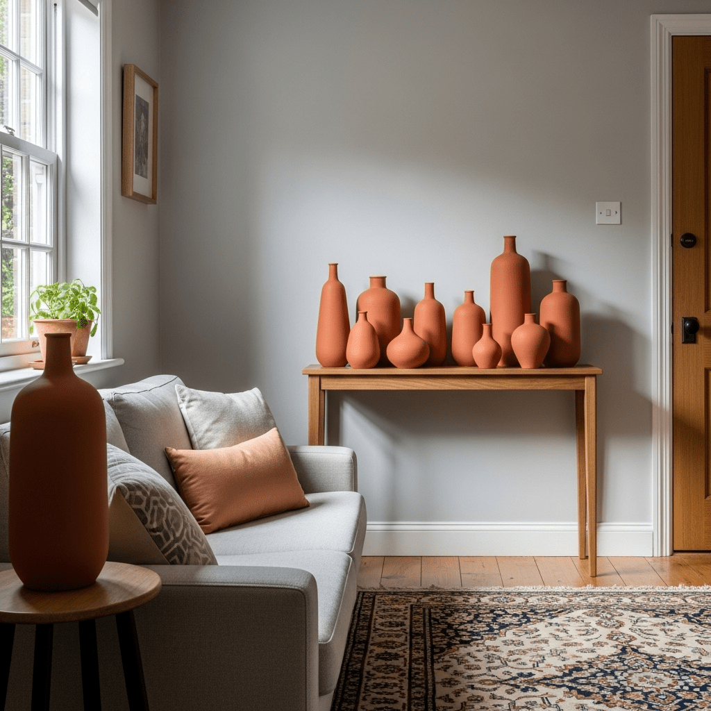 Organic modern living room small spaces designs incorporate handmade ceramics in warm, earthy tones. Grouping matte clay pots or terracotta vessels on a windowsill introduces a “human” element and a pop of warmth to a minimalist setup.