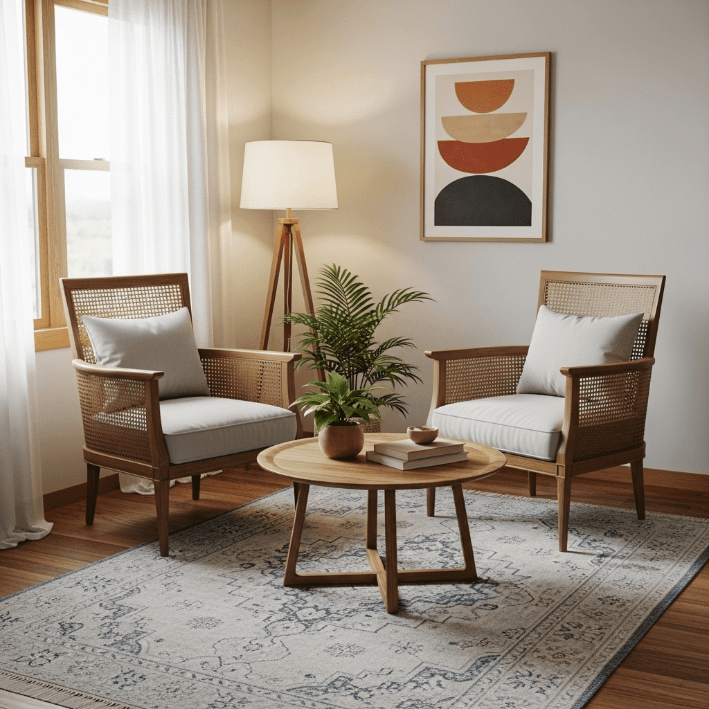 Organic modern living room small spaces designs use cane or rattan furniture to maintain “visual transparency.” A cane-back chair provides the necessary seating but allows light to pass through the weave, keeping the small space from feeling closed in.