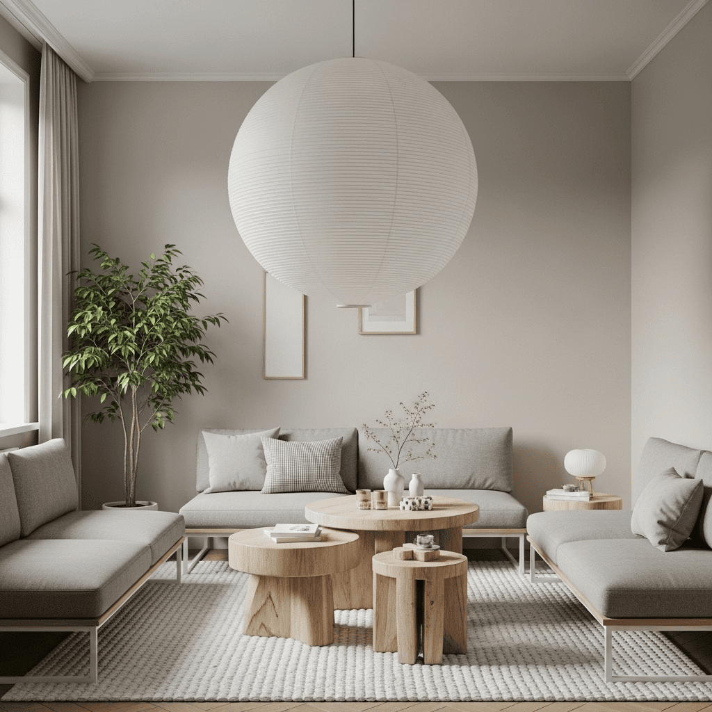 Organic modern living room small spaces designs use oversized rice paper lanterns for soft, ambient lighting. These lightweight fixtures add a delicate, organic shape to the ceiling and emit a warm glow that makes a small room feel ethereal.