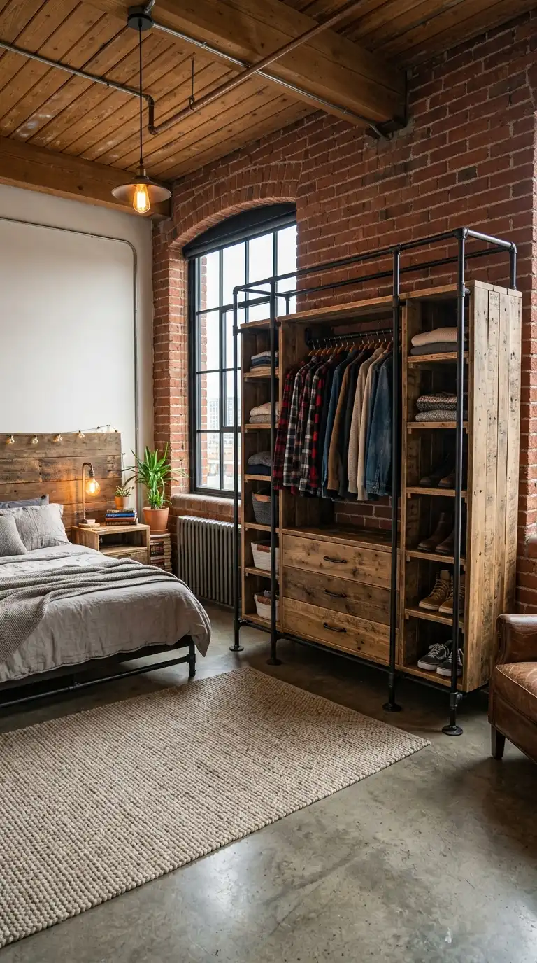 Combine pallet wood with black iron pipes for an industrial-chic wardrobe. Use pipes for the frame and hanging rods, and pallet wood for shelves and doors. This combination creates a rugged, urban aesthetic.