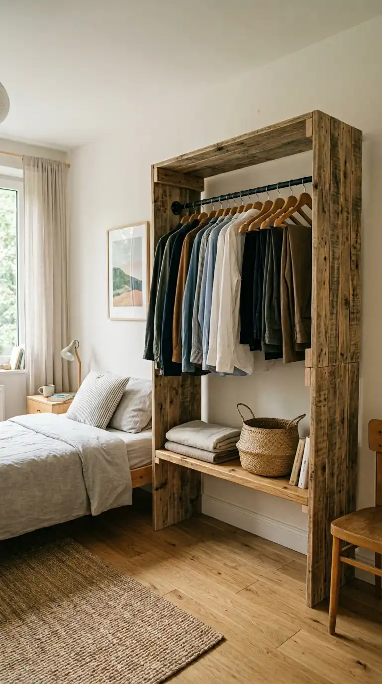 Create a simple open wardrobe using pallet wood for the frame and shelves. The open design allows easy visibility of clothes and accessories. Use uniform hangers and neatly folded items to maintain a polished appearance.