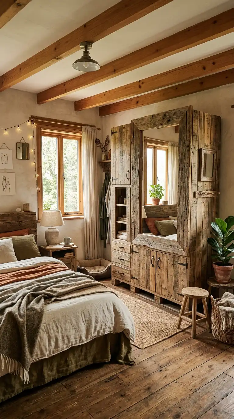 Incorporate a mirror into your pallet wardrobe for added functionality. Frame a large mirror with pallet wood and attach it to the door or use it as a sliding panel. The mirror adds light and makes the space feel larger.