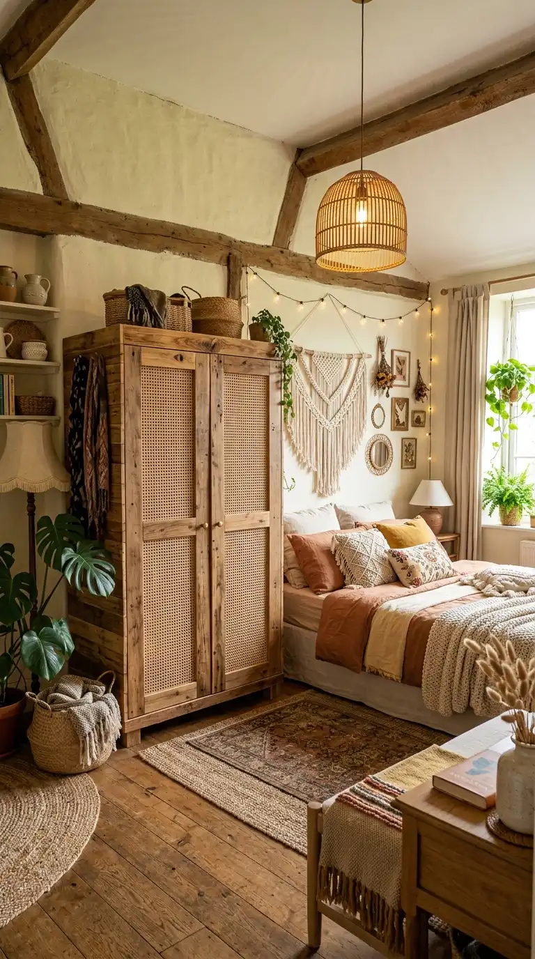 Add cane webbing to pallet wardrobe doors for a bohemian touch. Cut out sections of the wood and staple cane webbing into the openings. The natural texture softens the rustic wood and adds visual interest.